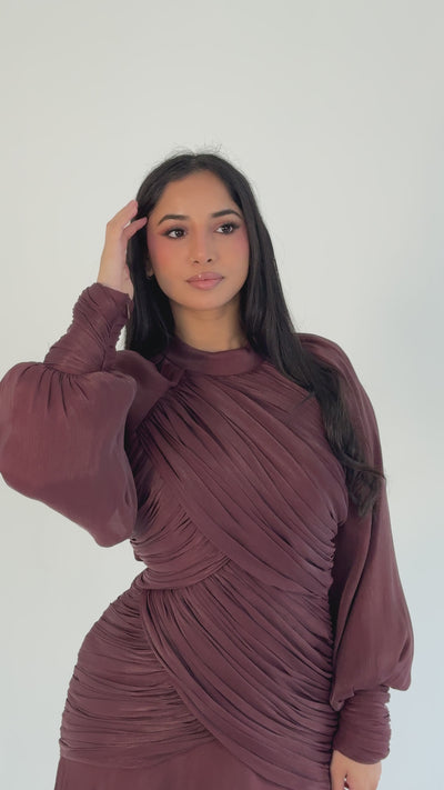 The Maya Dress features soft ruched detailing across the bodice, creating a flattering, sculpted shape. A gentle crossover drape adds beautiful dimension while maintaining elegant, full coverage.